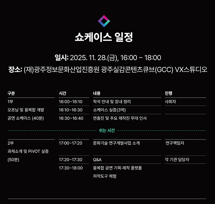오는 11월 28일 (금) 오후 4시, 광주실감콘텐츠큐브(GCC) VX스튜디오에서 실증공연 쇼케이스가 있을 예정입니다.
