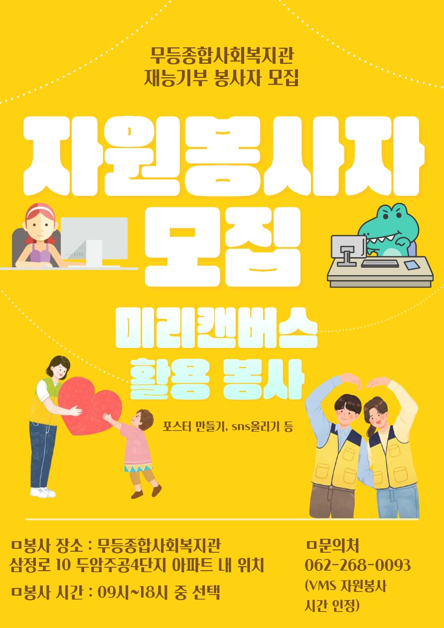 [자원봉사자 모집] 무등종합사회복지관에서 미리캔버스 활용가능한 자원봉사자를 모집합니다.
