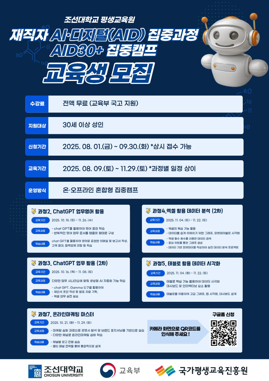 조선대학교 평생교육원은 교육부와 국가평생교육진흥원에서 주관하는 <재직자 AI·디지털(AID) 집중과정 AID 30+ 집중캠프>의 사업기관으로서 수강생을 모집하고자 하오니 많은 관심과 참여 부탁드립니다.