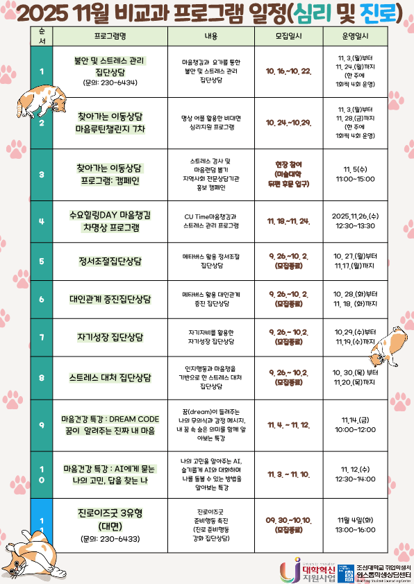 [원스톱학생상담센터] 2025 11월 심리상담・진로 비교과 프로그램 일정 안내