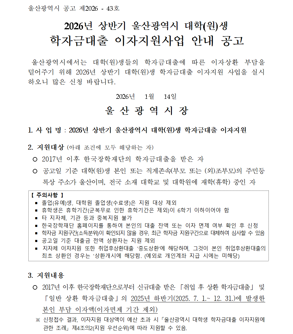 [울산광역시]2026년 상반기 대학(원)생 학자금대출 이자지원사업 안내